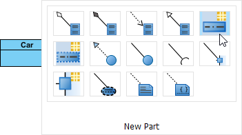 Example: In this example the Wheels and the Engine are the Parts of the Collaboration and the FrontAxle and the RearAxle are the Connectors. The Car is the Composite Structure that shows the parts and the connections between the parts.