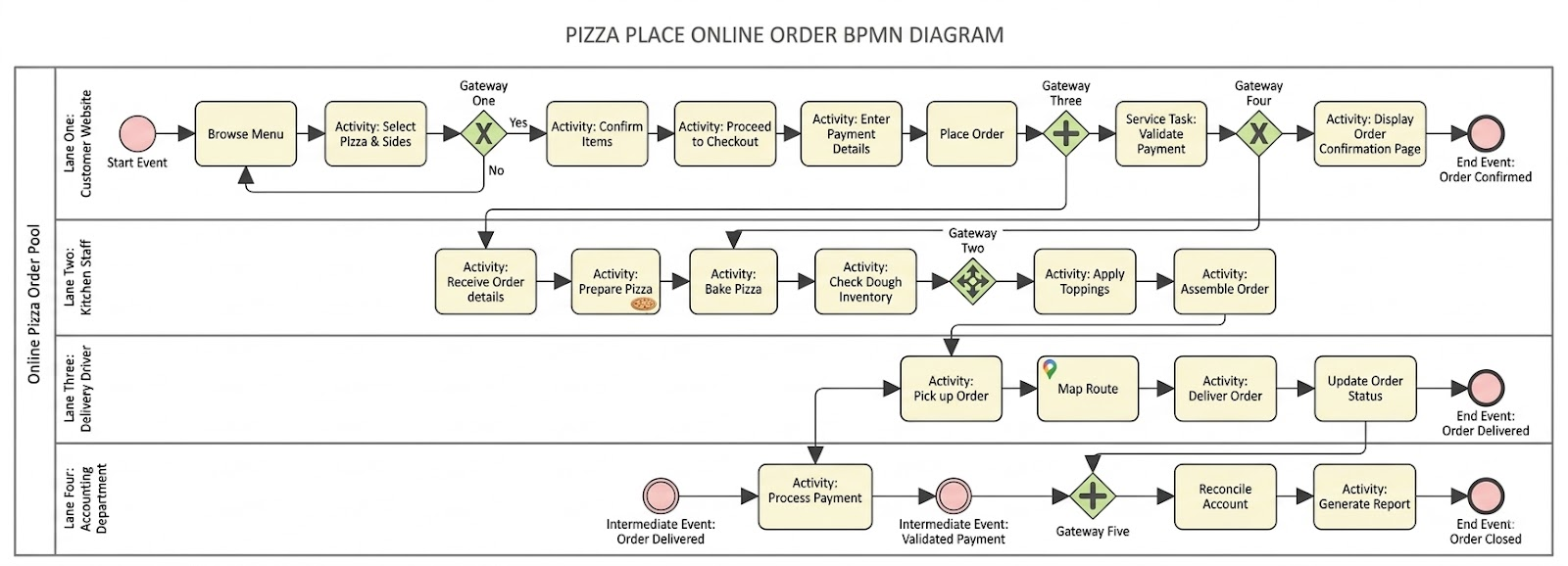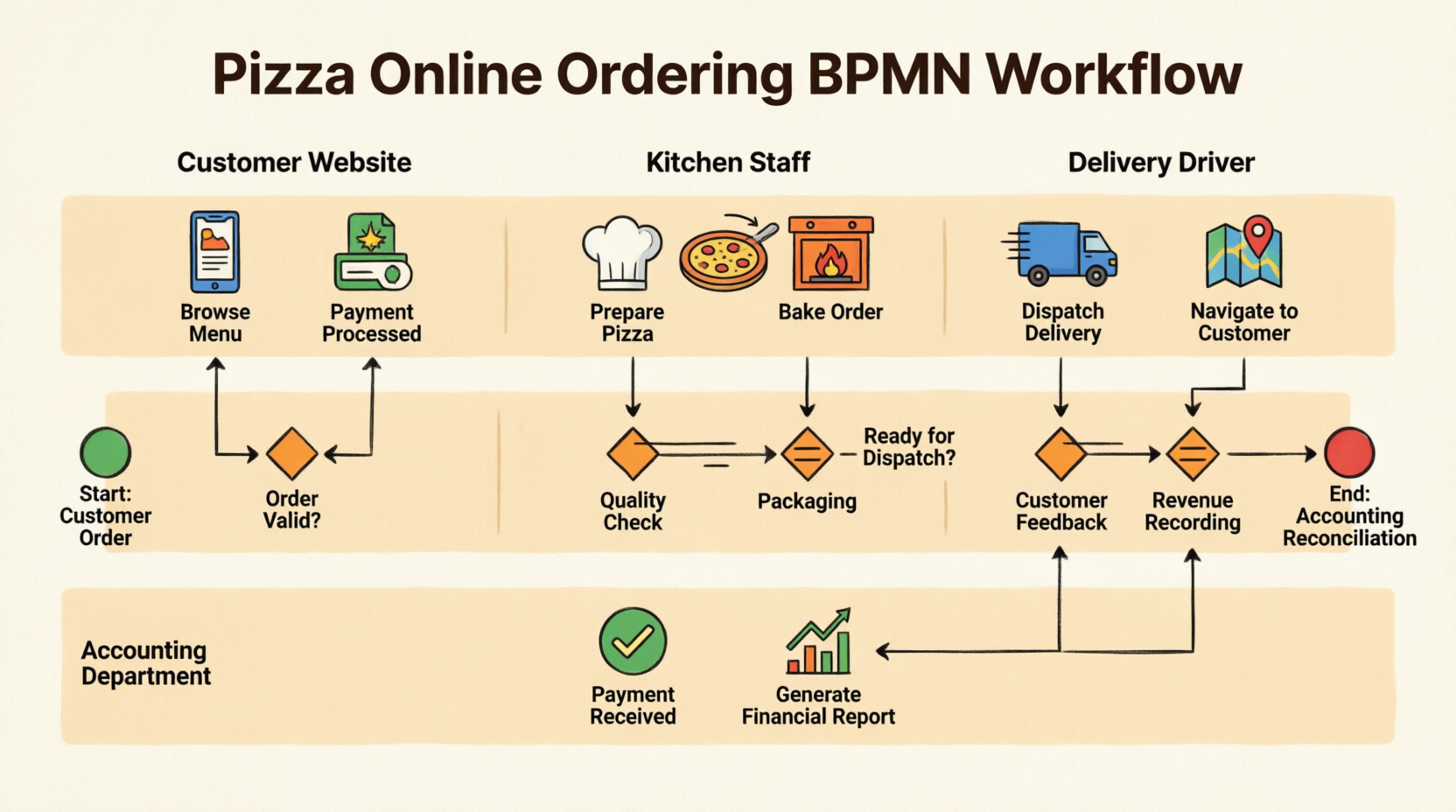 Mario’s Pizza Palace’s BPMN implementation transformed a fragmented, error-prone ordering process into a streamlined, efficient operation. By visualizing the entire workflow across four departments using standardized BPMN notation, the company achieved: