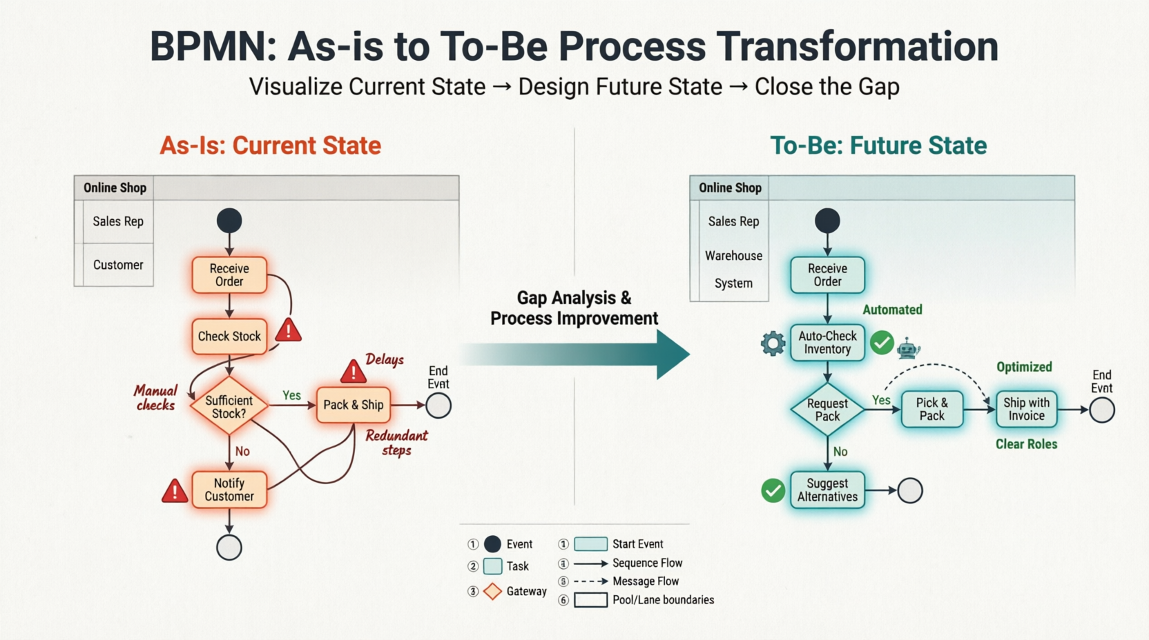 Plan transitions: Define how you’ll move from As-Is to To-Be (phased rollout, training, etc.)