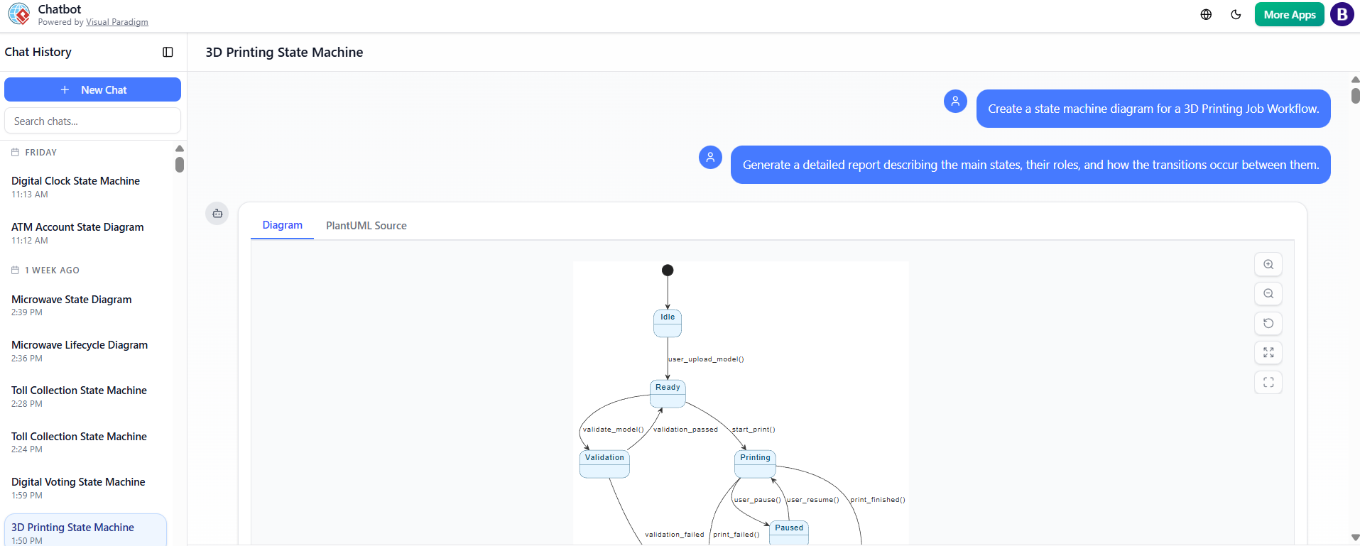 Using Visual Paradigm AI Chatbot, you can go from concept to a polished UML state machine diagram in minutes—far faster than manual tools or coding PlantUML. It’s ideal for prototyping behaviors in systems like 3D printers, IoT devices, or user interfaces. Try it today at chat.visual-paradigm.com!