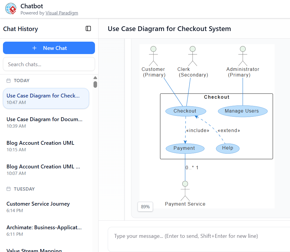 Visual Paradigm’s AI Chatbot (accessible at chat.visual-paradigm.com) revolutionizes this by turning natural language descriptions into fully rendered, editable UML use case diagrams in seconds. It handles layout, notation, relationships, and basic UML semantics automatically.
