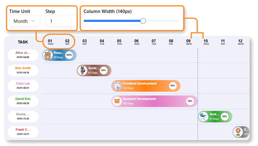 Interactive Timeline: Users report being able to easily configure the Date Range, Time Unit (day, week, month), and Column Width using simple sliders and pickers. Teams appreciate the intuitive nature of these controls, which eliminate the need for complex manual adjustments.