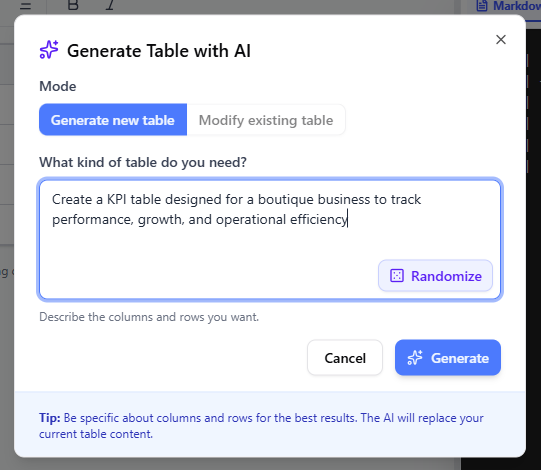 Follow this step-by-step workflow to maximize efficiency when using the AI Table Generator.