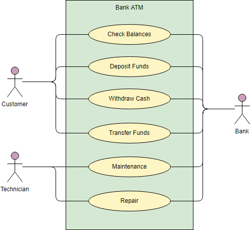 Here I choose some example from Visual Paradigm Online that you should be quite familiar with the business, such as ATM, DMS, and order system. The figure below shows an ATM use case diagram example, which is quite a classic example to use in teaching use case diagram.
