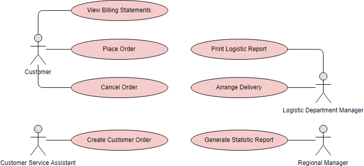 The Order System use case diagram example below shows the actors and use cases involved in the system: