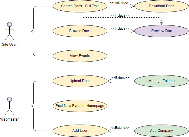 The Document Management System (DMS) use case diagram example below shows the actors and use cases of the system. In particular, there are include and extend relationships among use cases.