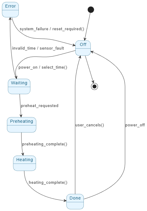 - Realism and Best Practices The AI suggested practical enhancements: sensor-based transitions (preheating_complete(), heating_complete()), user cancellation paths, and a composite Error state with reset logic—aligning the model with real-world microwave firmware requirements (e.g., safety standards like IEC 60335).