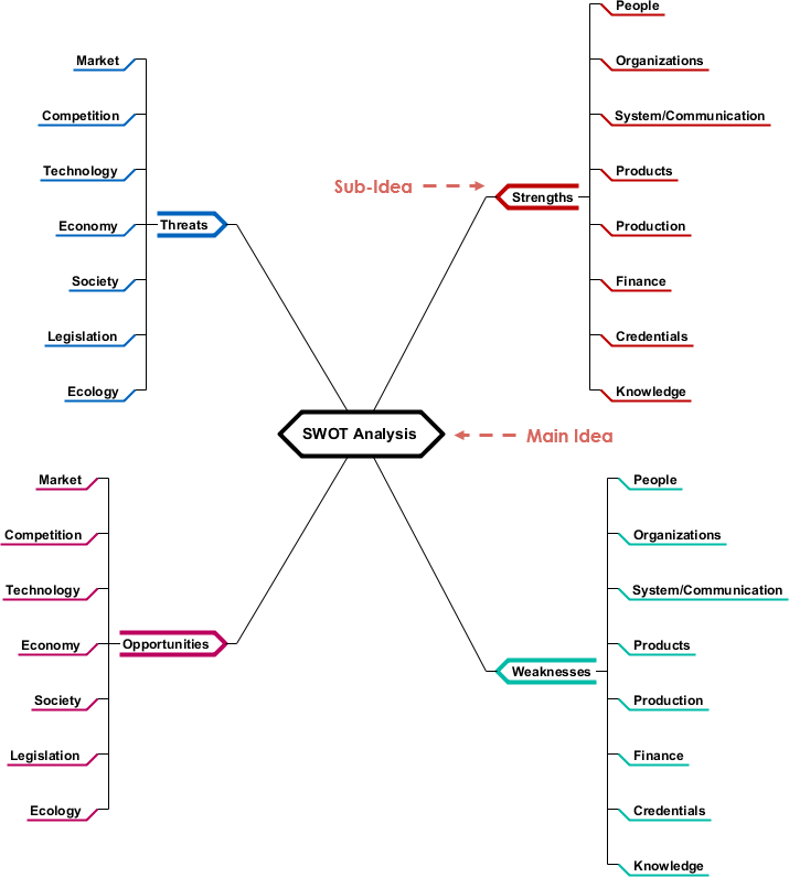 So how to Use Mind Map to Perform SWOT Analysis? Here is a simple template for SWOT and the branch out sub-categories, add or remove them as appropriate and also add content to it.