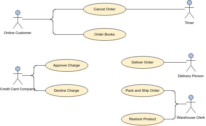 This example depicts a model of several business use cases (goals) which represents the interactions between a restaurant (the business system) and its primary actors.