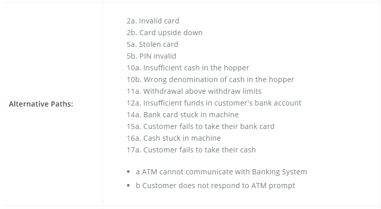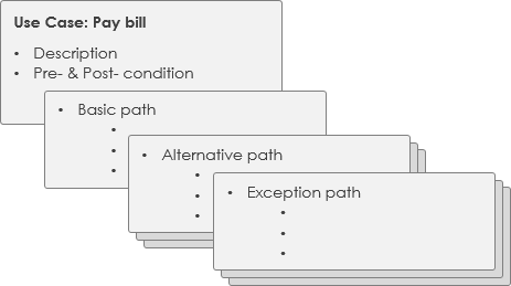 3. Describes one main flow of events (main scenarios) and possibly other exceptional flows (alternatives), also called paths or user scenarios