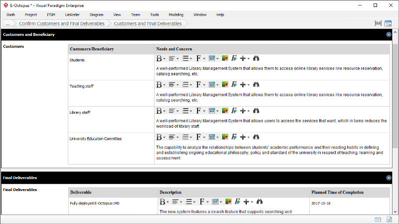 The project management toolset provides out-of-the-box deliverables templates which are associated with the pre-defined work items and forms. Simply perform the analysis and fill-in the forms. The information collected in the form you filled in, will be consolidated incrementally for generating project deliverables.
