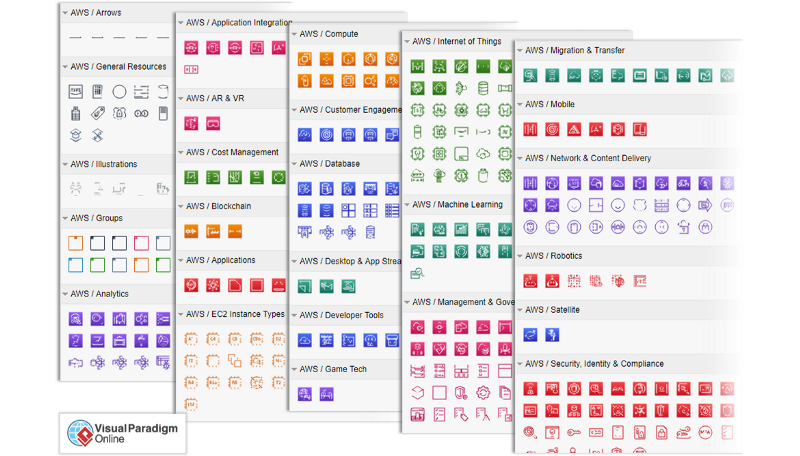 Amazon Web Services (AWS) has officially released a comprehensive transformation of its AWS architecture icons. The latest updates to Visual Paradigm Online make new AWS icons available. Users can now create AWS Schema diagrams using the latest and best AWS Schema icons , or continue to use the previous AWS Icon Sets according to their choice.