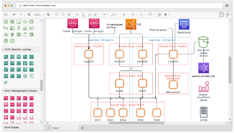 If you use Amazon Web Services, you’ll love our online AWS Schema diagram tool. The online A WS charting toolprovides you with the latest set of AWS icons ( 2019 AWS icons ) for use in AWS architecture design . In addition, you can connect these AWS shapes to traditional UML shapes such as nodes, components, and artifacts in a UML deployment diagram to better represent your ideas.