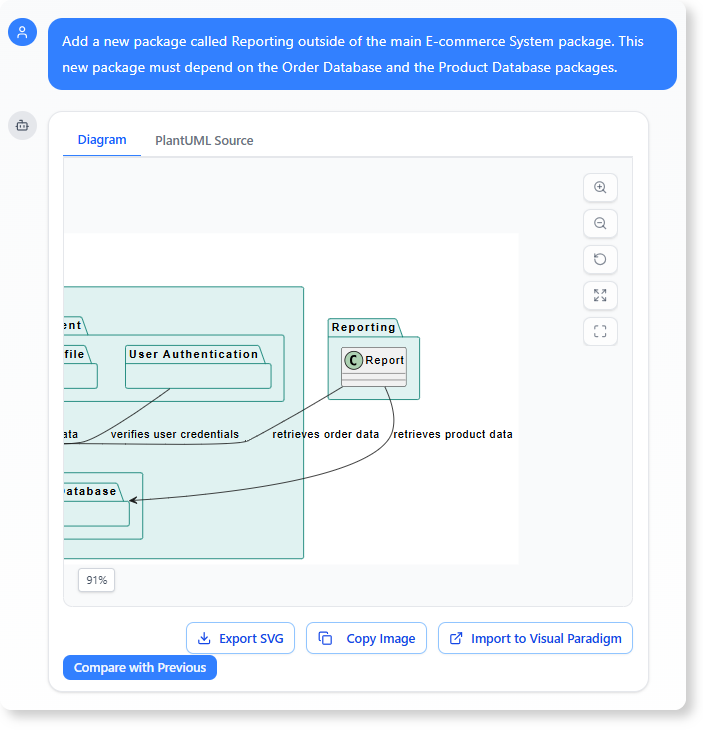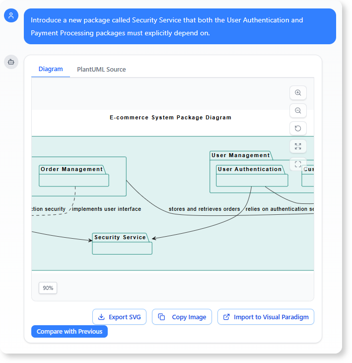 The AI Chatbot responds by creating a detailed, multi-layered architecture instantly. This model includes five major component groups (e.g., Product Management, Order Processing, User Management), ten nested sub-packages, and proactively introduced advanced UML concepts like Generalization and Realization for managing UI components. This rich output accelerates the design process by immediately providing a strong, compliant foundation.