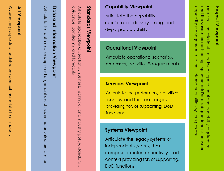 The DoDAF framework can be broadly composed of eight views and implementation methodologies. The eight views are as follows.