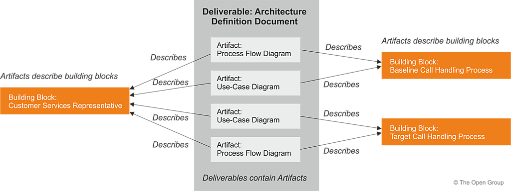 An Architecture Definition Document is a deliverable that documents an Architecture Description. This document contains a number of complementary artifacts that are architecture views of the building blocks relevant to the architecture. For example, a process flow diagram (an artifact) may be created to describe the target call handling process (a building block). This artifact may also describe other building blocks, such as the actors involved in the process (e.g., a Customer Services Representative). The relationships between deliverables, artifacts, and building blocks are illustrated in the following diagram: