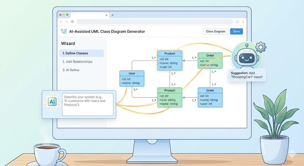 The AI-Assisted UML Class Diagram Generator is a powerful, browser-based tool that makes creating professional UML class diagrams simple and accessible. It combines an intuitive step-by-step wizard with AI assistance to help users—from beginners to experts—design, analyze, and export diagrams without needing to master complex syntax like PlantUML.