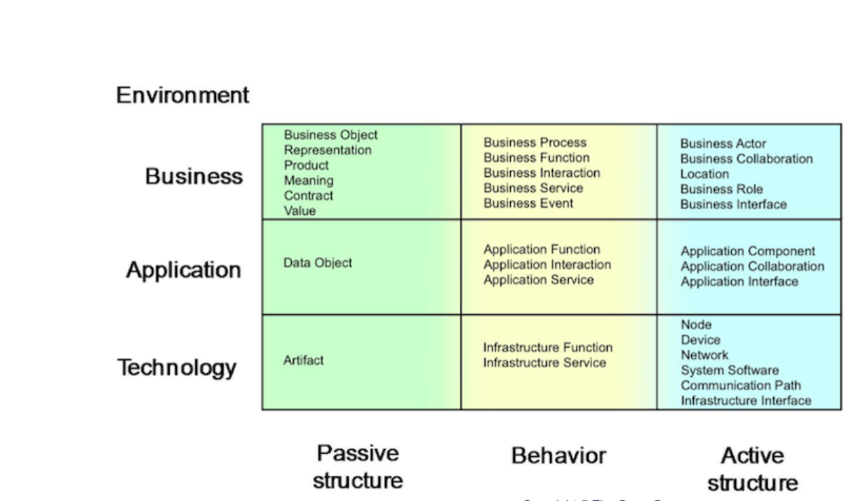 The ArchiMate Core Framework combines these layers and aspects into a matrix of nine cells. Each cell represents a specific combination of a layer and an aspect. For example: