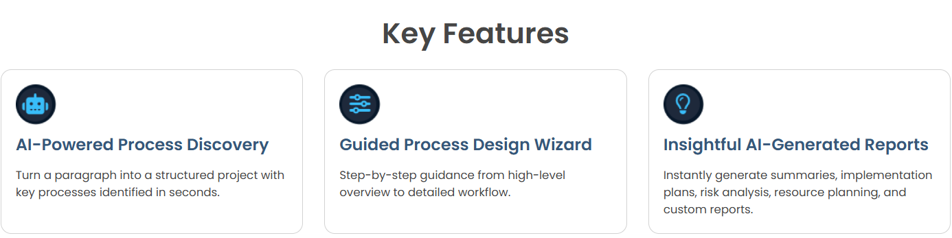- How It Works: Start with a high-level description (e.g., a problem statement like inconsistent customer complaint handling). The AI parses it to generate an initial process framework, including goals, scope, and potential inefficiencies.