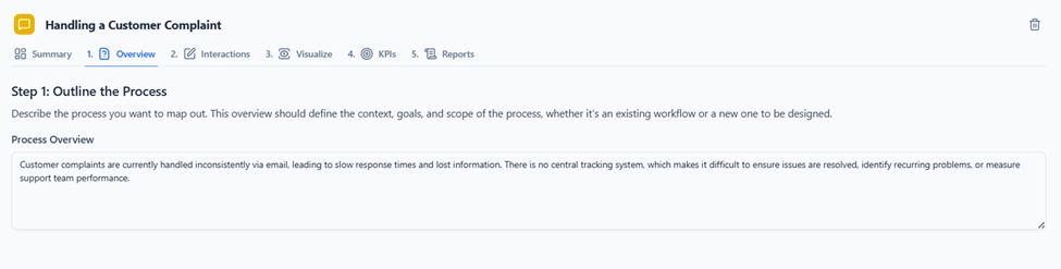 - Overview Tab: Define the core “why” of your process with a problem statement or summary. This sets the strategic context.