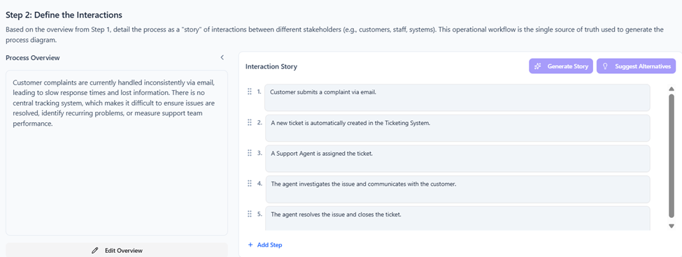 - Visualize Tab: Automatically generates a visual diagram from your interaction story, showing flows between stakeholders (e.g., swimlane diagrams with arrows indicating actions like “submits complaint” or “assigns ticket”).