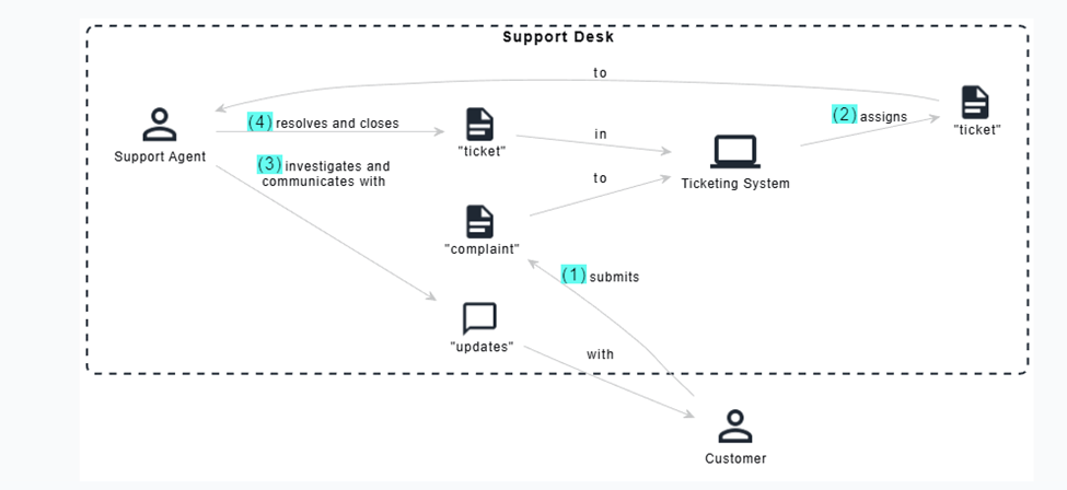 - Visualize: A diagram with stakeholders like “Customer,” “Support Agent,” “Ticketing System,” and flows like “submits,” “assigns,” “investigates.”