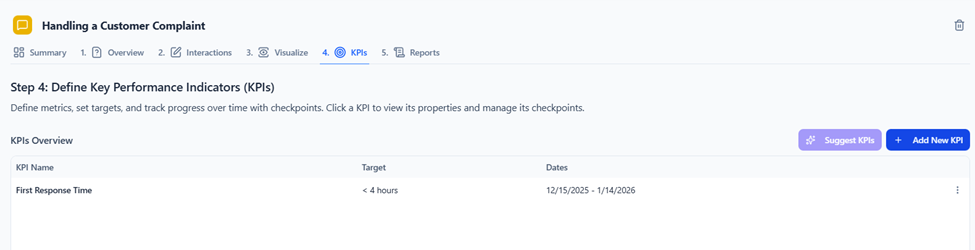- Description: A step-by-step interface that guides you from a high-level overview to a detailed workflow. It includes tabs for Overview, Interactions, Visualize, KPIs, and Reports.