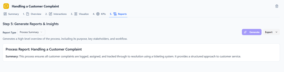 - How It Works: Navigate to the Reports tab to select or customize report types. The AI pulls from your process data to produce detailed, actionable outputs.