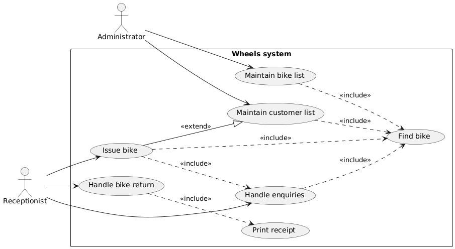 In the context of the Wheels bike hire system, we have demonstrated how to create use case diagrams that capture the interactions between different actors (Receptionist and Administrator) and the system’s functionalities (such as maintaining bike and customer lists, handling enquiries, issuing bikes, and handling bike returns). We have also shown how to incorporate relationships like “include” and “extend” to represent common and additional behaviors, respectively.