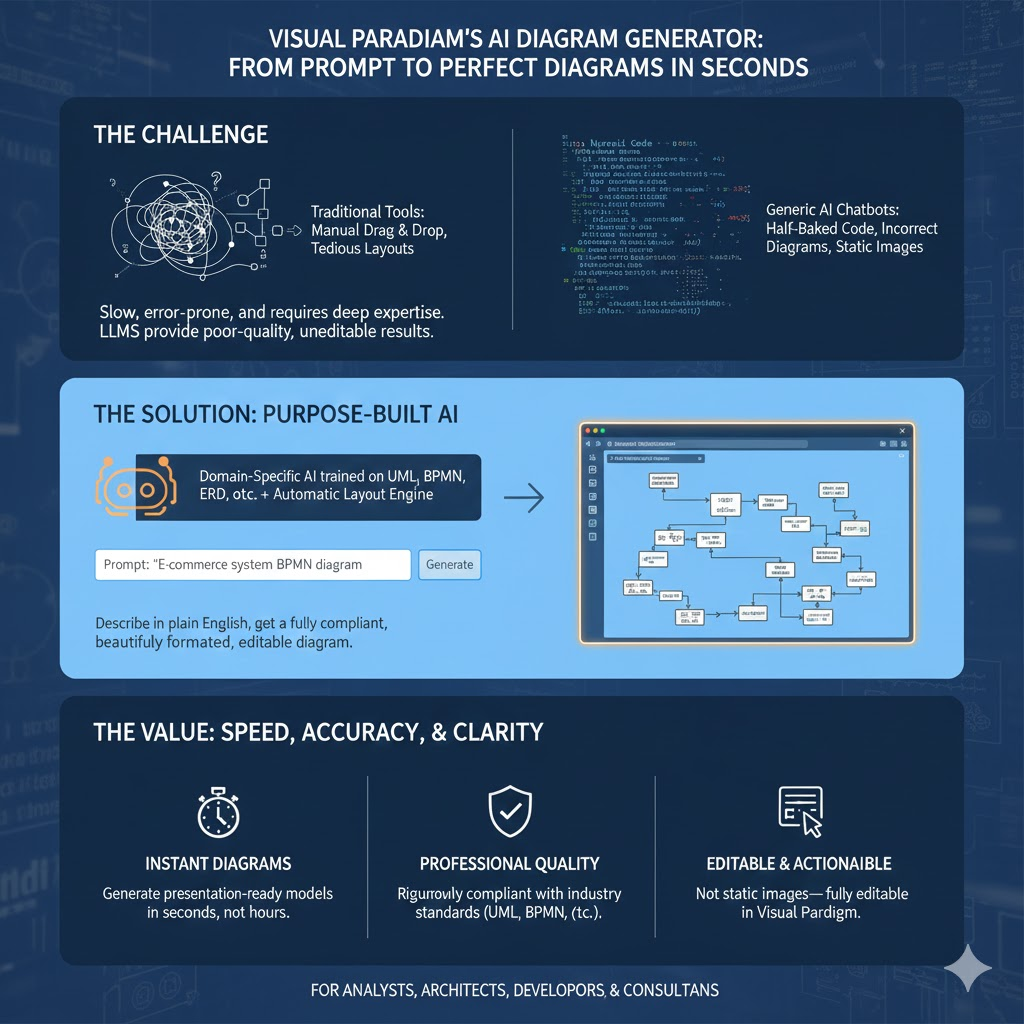 Visual Paradigm’s AI Diagram Generator is not “yet another ChatGPT wrapper.” It is a domain-specific AI that understands diagramming standards at a level no general-purpose LLM has achieved in 2025.