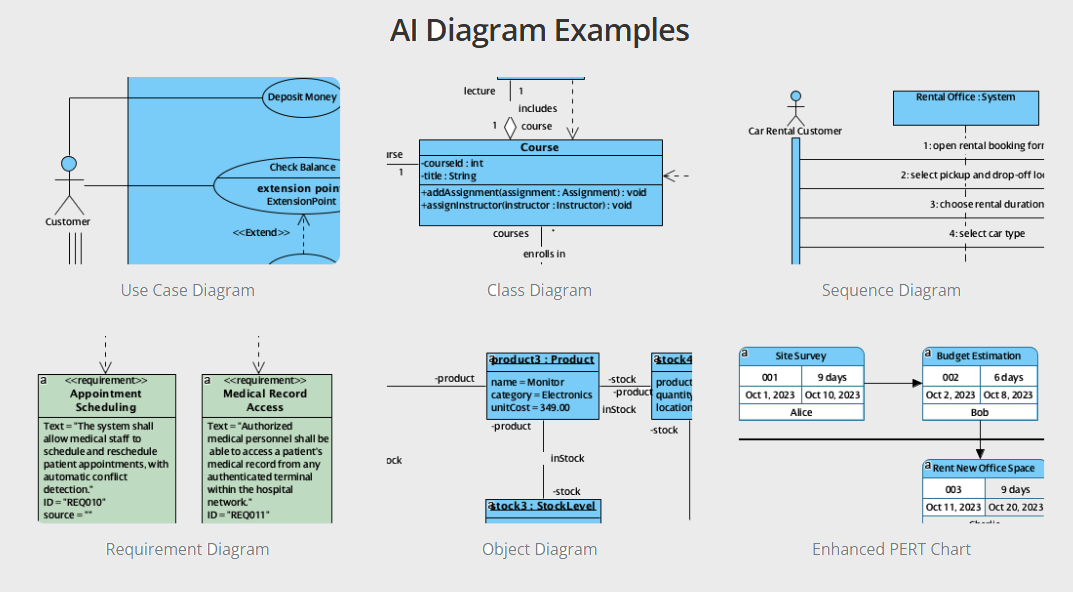 Visual Paradigm’s AI Diagram Generator changes the game completely. It is not a generic LLM with a diagramming plugin — it is a purpose-built, domain-specific AI trained exclusively on modeling standards (UML, BPMN, SysML, ArchiMate, ERD, PERT, etc.) and paired with Visual Paradigm’s industry-leading automatic layout engine. The result? You describe what you need in plain English, and in seconds you get a fully compliant, beautifully formatted, presentation-ready, and completely editable diagram — no fixes required.