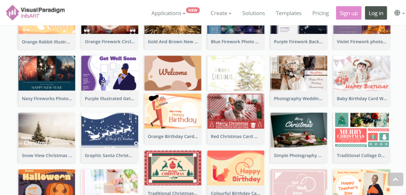 Now you can create personalized cards in minutes. Try Visual Paradigm Online and instantly make photo cards, postcards, and invitations with their professional pre-made templates. Browse through the huge collection of infographics, visuals and Merry Christmas themed templates already made for you. Choose the layout you like best and kickstart in a minute.