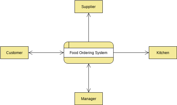 The figure below shows a context diagram (top-level data flow diagram) drawn for a food ordering system.