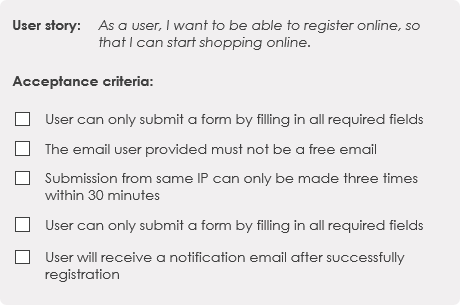 The acceptance criteria for user stories include a set of test scenarios that will meet the requirements to confirm whether the software works as expected.