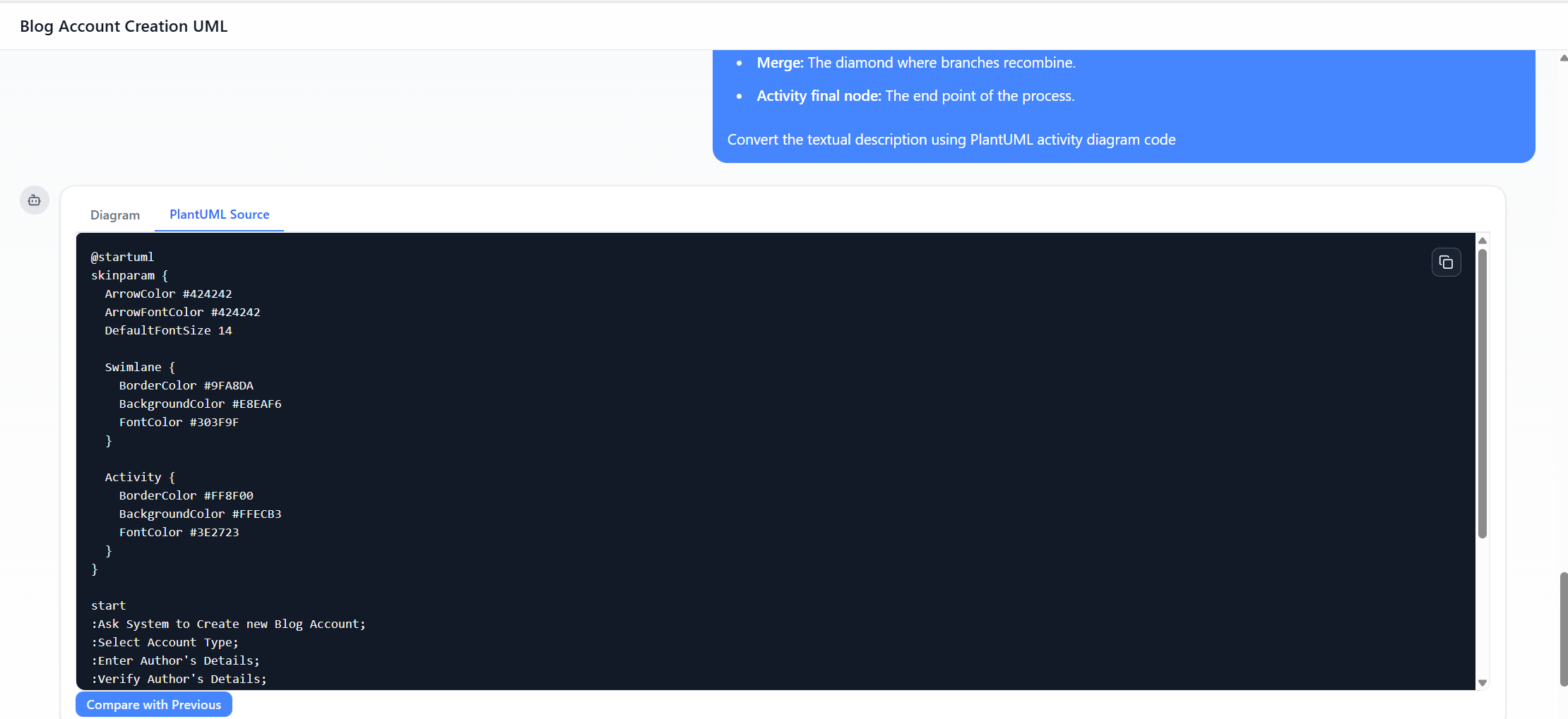 - The AI updates the diagram and PlantUML code in real-time (use “Compare with Previous” to see diffs).