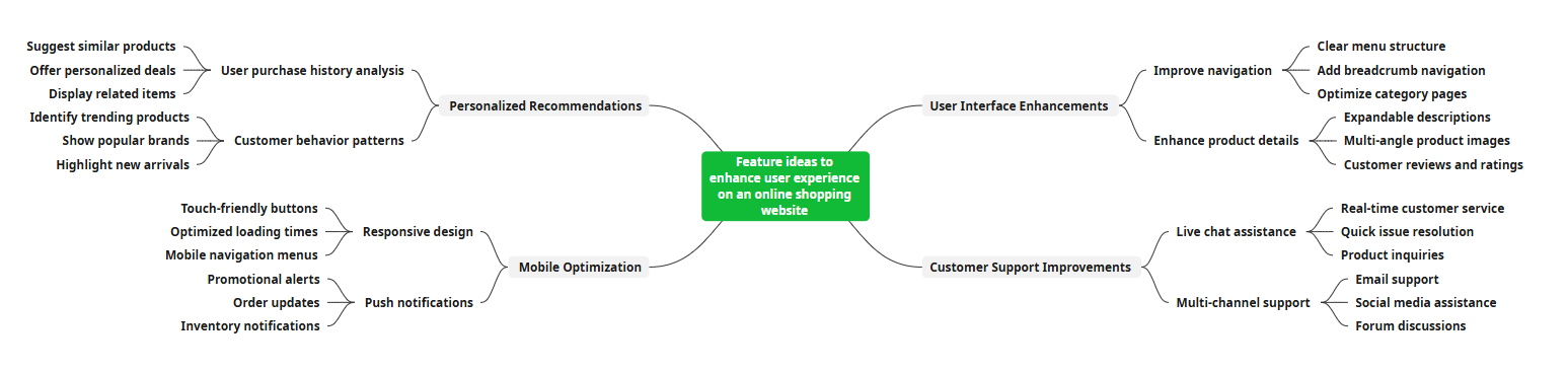 Generate outlines like “Feature ideas to enhance user experience on an online shopping website” in minutes. AI maps identify customer pain points, trending designs, and supply chain logistics.