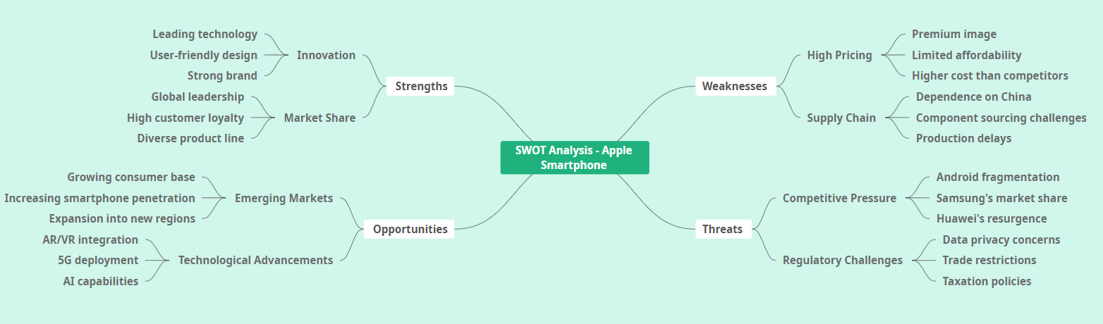 Visualize SWOT analysis templates for companies like Apple, breaking down strengths (brand loyalty), weaknesses (high pricing), opportunities (AR tech), and threats (market saturation).