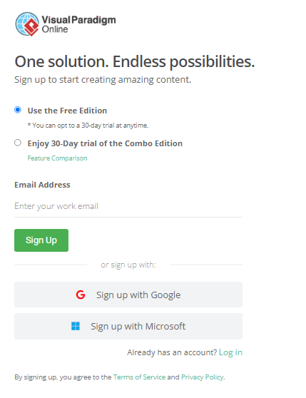 - Sign up for a Visual Paradigm Online account, and then open the workspace page. You should be redirected to the workspace page but if not, visit: https://online.visualparadigm.com/drive/#infoart:proj=0&dashboard