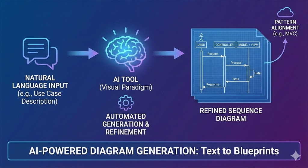 Visual Paradigm’s AI Sequence Diagram Refinement Tool addresses this challenge by leveraging artificial intelligence to automatically generate and refine sequence diagrams directly from natural language inputs, such as use case descriptions. This tool transforms simple, textual prompts into multi-layered architectural blueprints, often aligning with patterns like MVC (Model-View-Controller) to ensure separation of concerns. In this guide, we’ll explore how to use the tool step by step, explain its inner workings, and provide practical examples based on its capabilities.