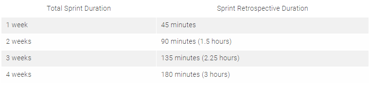 The thumb rule for the length of a sprint retrospective meeting is that it usually take no more than 45 minutes per week of sprint duration. The following table illustrates this rule: