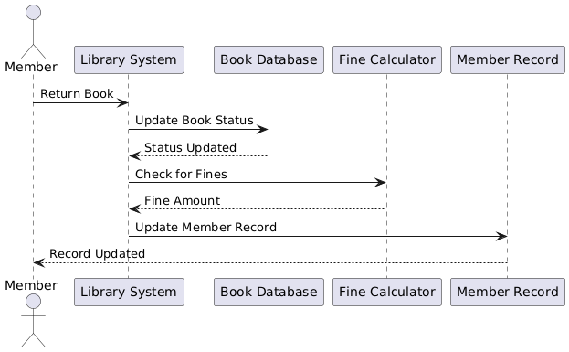 Problem Statement: A library member returns a book. The system needs to update the book’s status, check for any fines, and update the member’s record.