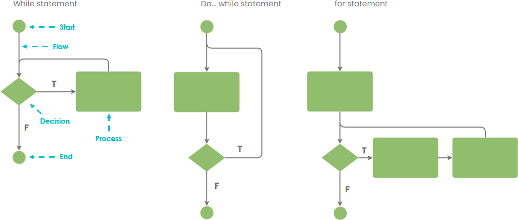Repetition – Often, we may want to execute the same set of processes multiple times, and we can execute a loop that does the same set of actions over and over until a stop condition occurs. Failure to provide a stop condition will cause the process to enter an infinite loop