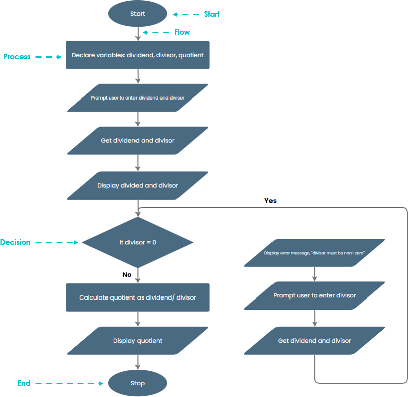 Express an algorithm that gets two numbers from the user (the dividend and the divisor) and tests to ensure that the divisor is not zero. Ensure that the divisor is not zero and use a flowchart to show their quotient.