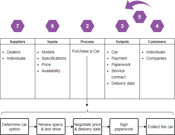 The following steps describe how to create a SIPOC map with your team in the context of “A Car Purchasing Process” example: