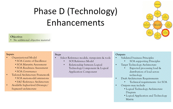 Phase D is the phase of TOGAF, which develops the technical architecture for the architecture project. Technology architecture describes the structure and interaction of platform services and logical and physical technology components. Phase D develops the target technology architecture that supports the data and application components (developed in Phase C), enabling the business components.