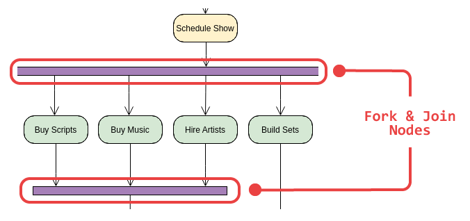 - Usage: Multiple incoming flows and a single outgoing flow. The outgoing flow cannot begin until all incoming concurrent flows have completed (synchronization).