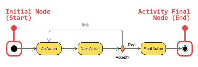 An Activity Diagram is built upon nodes (representing steps) and edges (representing the flow of control).