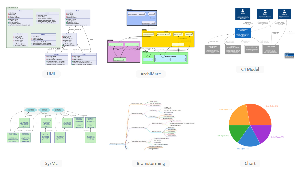 | Support for multiple modeling languages | Limited to text-based syntaxes. | One toolset for UML, SysML, BPMN, ArchiMate, ERD, mind maps, and more—everything stays consistent and interoperable. |