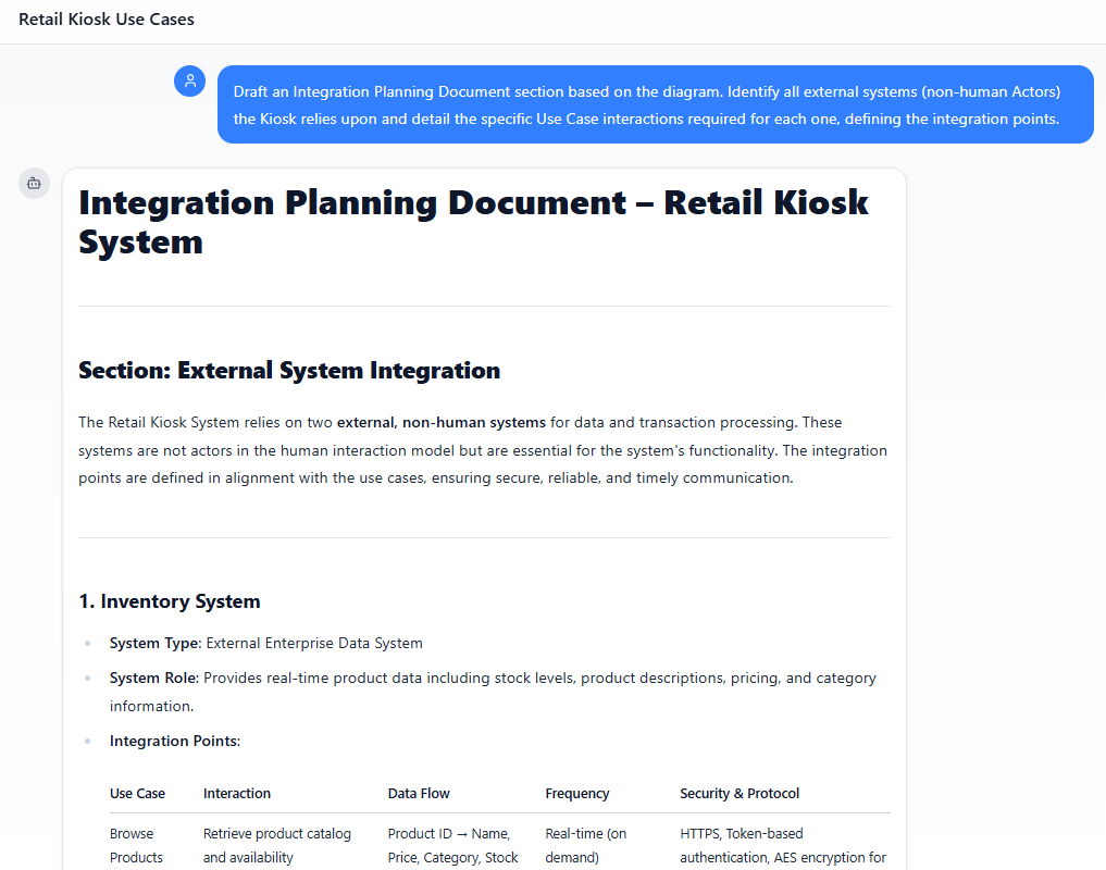 - Benefit: This task uses the diagram to generate documentation for the integration team, defining the required external APIs and contractual interactions necessary for the Kiosk to function, ensuring no integration point is missed.
