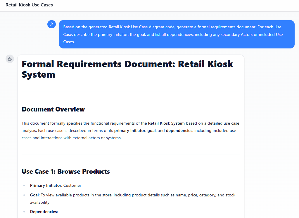“Based on the generated Retail Kiosk Use Case diagram code, generate a formal requirements document. For each Use Case, describe the primary initiator, the goal, and list all dependencies, including any secondary Actors or included Use Cases.”